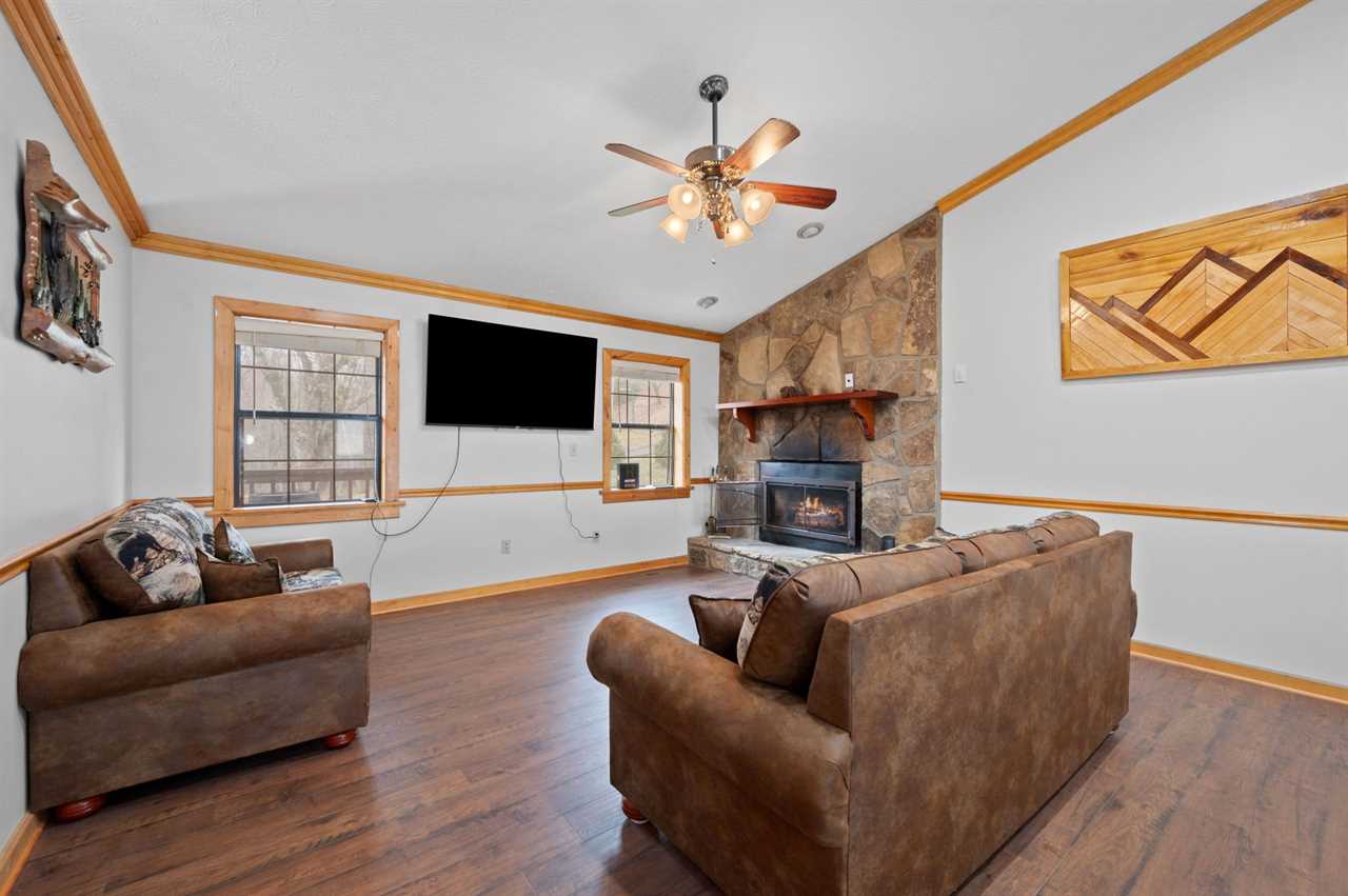 Step into a warm and inviting living room that blends rustic charm with modern comfort. The loveseat and sleeper sofa, upholstered in a combination of leather and bear-print fabric, provide both style and comfort for relaxing after a day in the mountains. Gather around the stone gas fireplace for a cozy evening or enjoy your favorite shows on the large flat-screen TV with streaming services. With its open flow into the dining area and kitchen, this space is perfect for spending time together with family and friends. For added convenience, a full-sized washer and dryer are located just down the hall.
