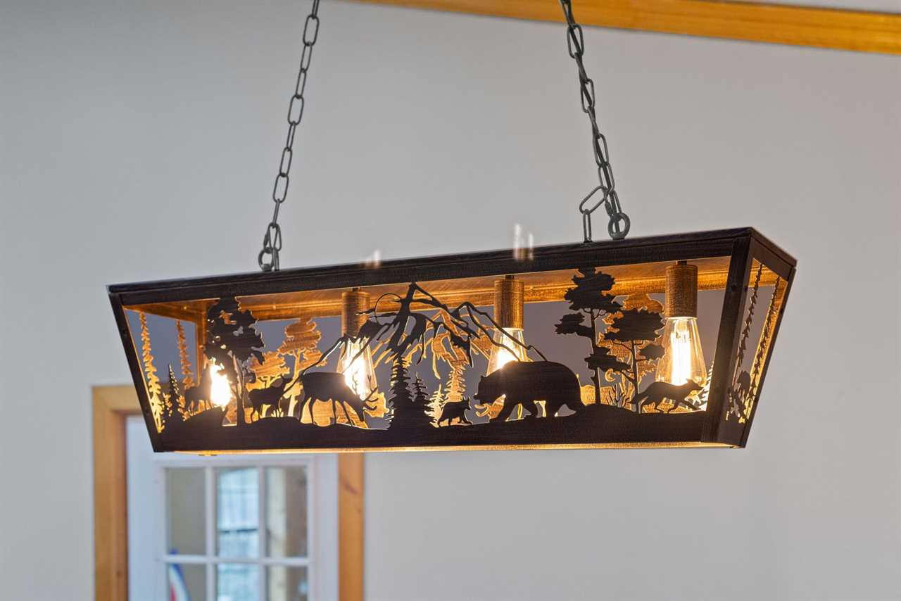 Directly off the living room, the kitchen and dining area provide the perfect space for meals and gathering. A log dining table seats eight comfortably, with additional countertop seating for two. The fully equipped kitchen includes a full-sized refrigerator, electric range, dishwasher, microwave, coffee maker, Keurig, and toaster, along with dishes and utensils for your stay. Double doors open to the back deck, while a side door leads to the garage, which features a dart and axe-throwing board for extra fun. Dish towels, starter dish soap, and starter dishwasher pods are provided.