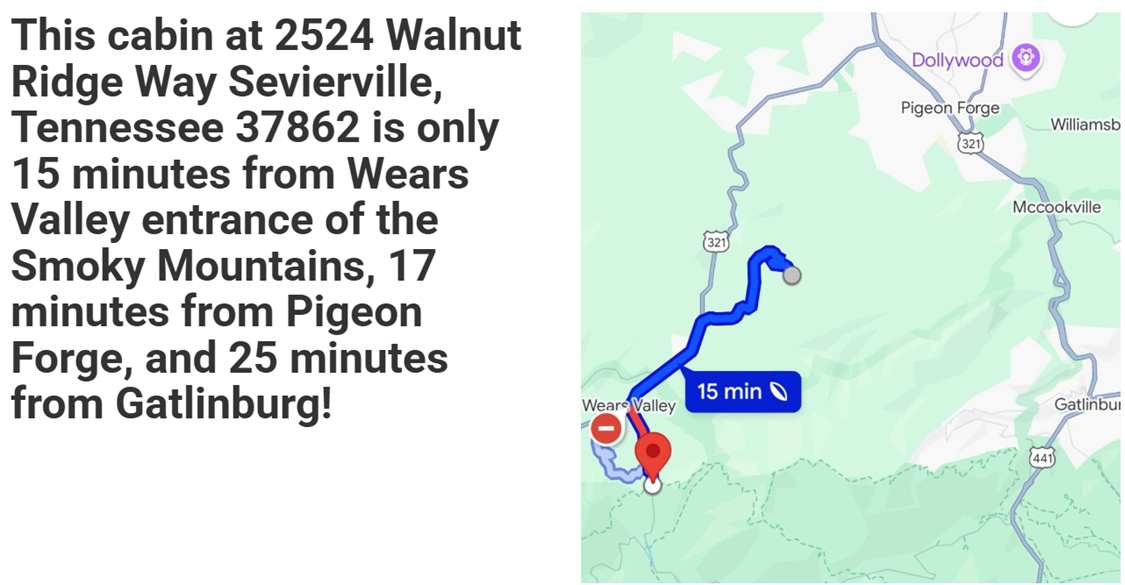 Located in the Dogwood Farms community, this home offers easy access with all paved roads leading directly to a level, paved driveway. Parking is plentiful, with a two-car garage plus additional paved space for up to four vehicles. Guests will appreciate being just 15 minutes from the Great Smoky Mountains National Park and Pigeon Forge, 25 minutes from Gatlinburg, and within quick reach of everyday essentials only 10 minutes to Dollar General and about 20 minutes to the nearest full grocery store.