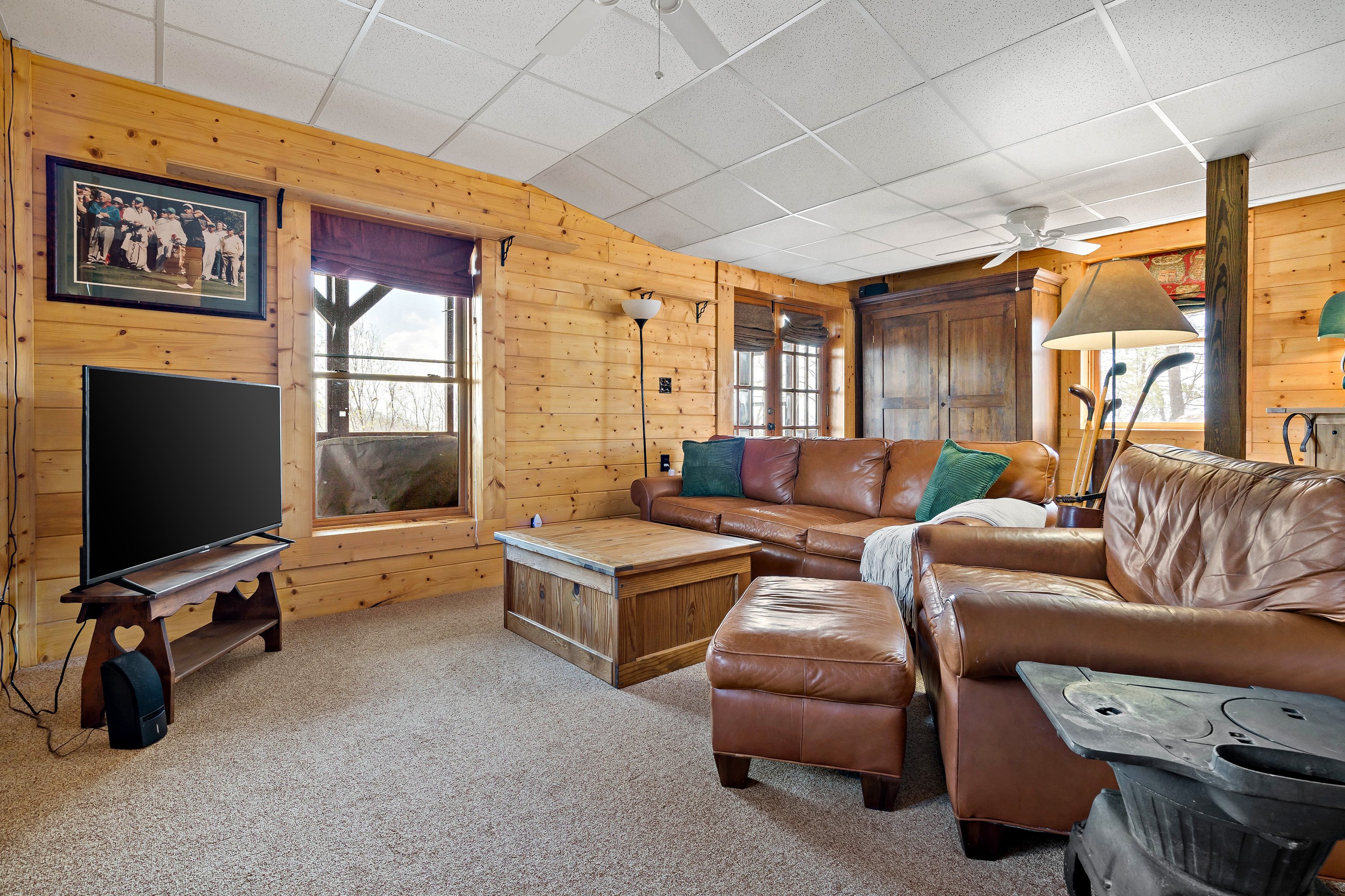 The downstairs family room features a second electric fireplace and custom bar—a great place to unwind.