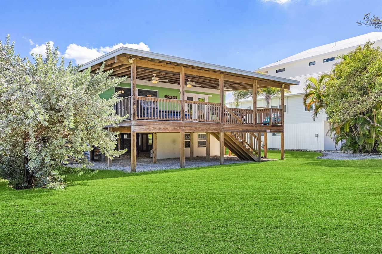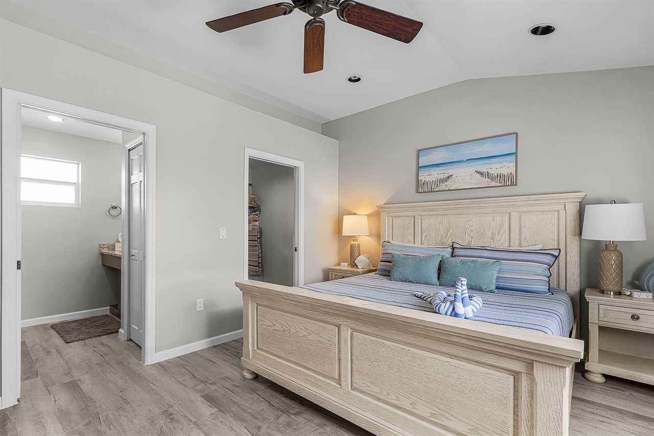 One of the highlights of this home is its covered back porch overlooking the canal. With three ceiling fans, a high-top table with seating for four, a large couch, and a few Adirondack chairs, it's the perfect spot to enjoy your morning coffee, an evening drink, or simply take in the tranquil water views and Margaritaville's twinkling lights across the canal.