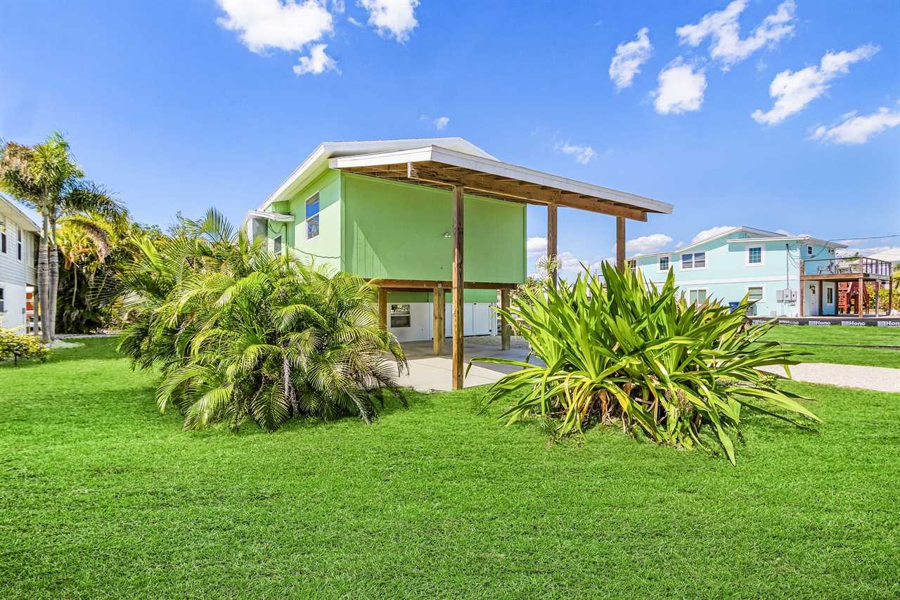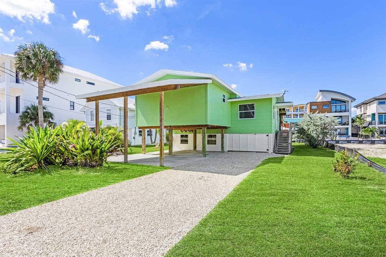 When you arrive, you'll be greeted by the inviting coastal-green exterior and a spacious driveway with room for up to three vehicles. Around back, the private dock sits along a peaceful canal, offering beautiful views of the Margaritaville Resort — a perfect backdrop for morning coffee or evening cocktails.