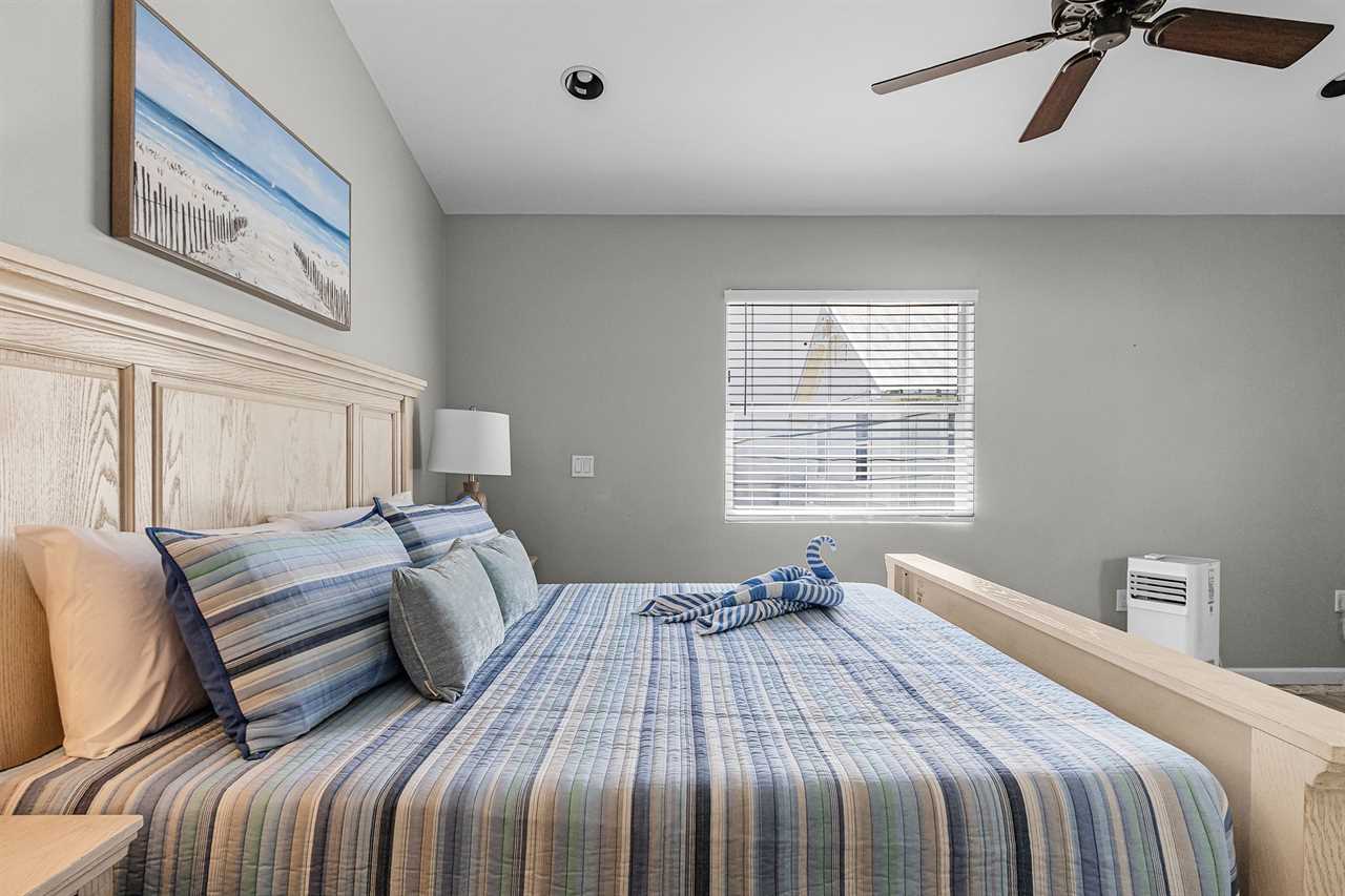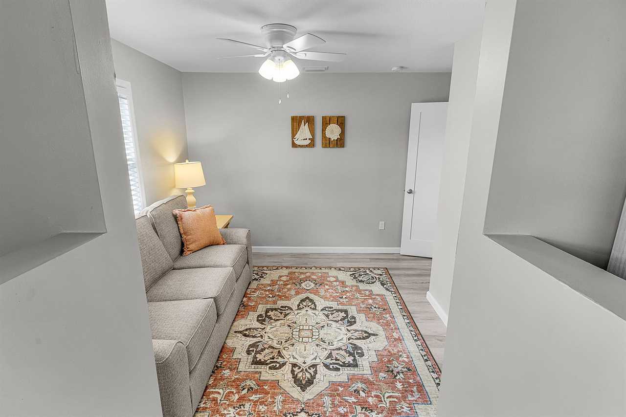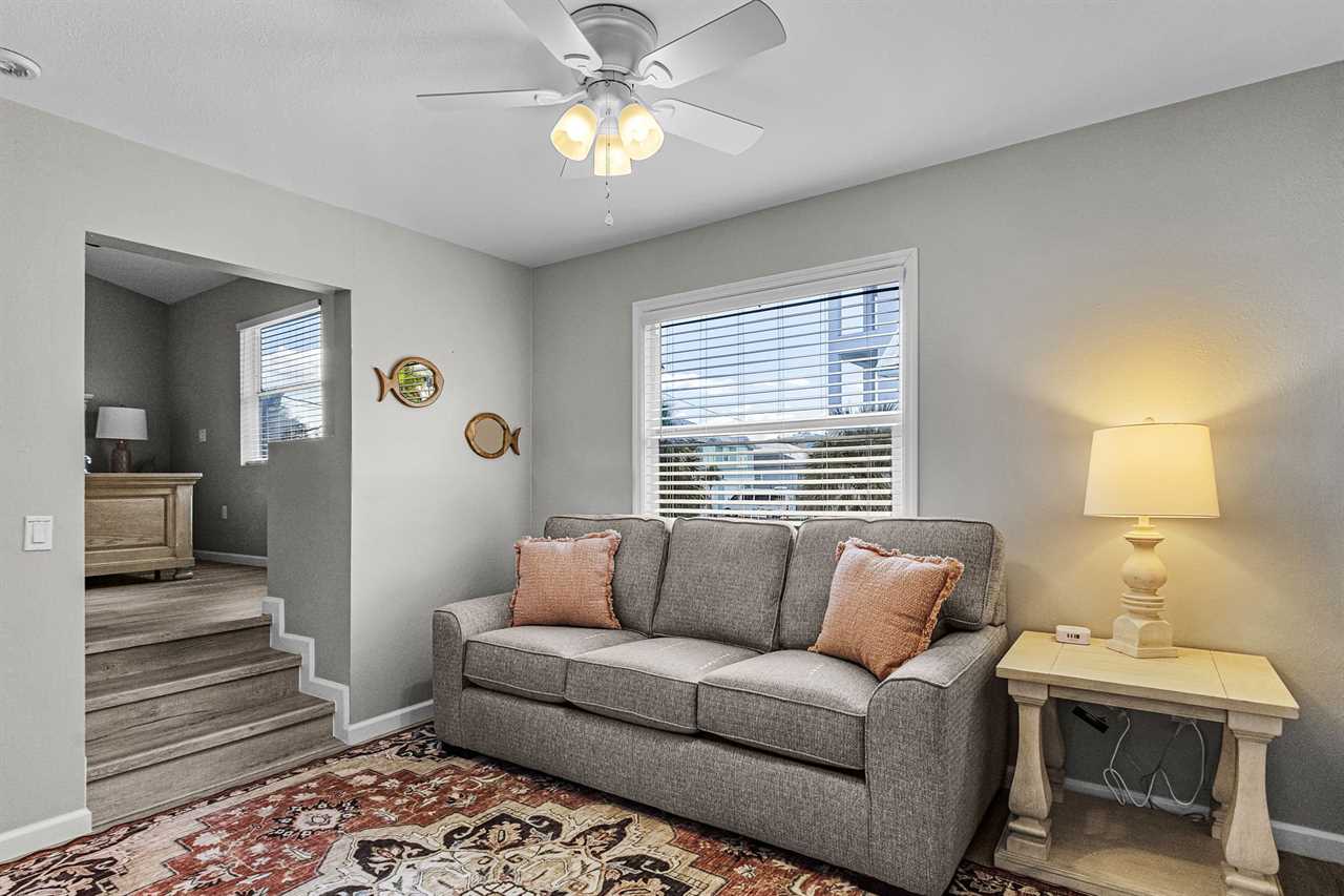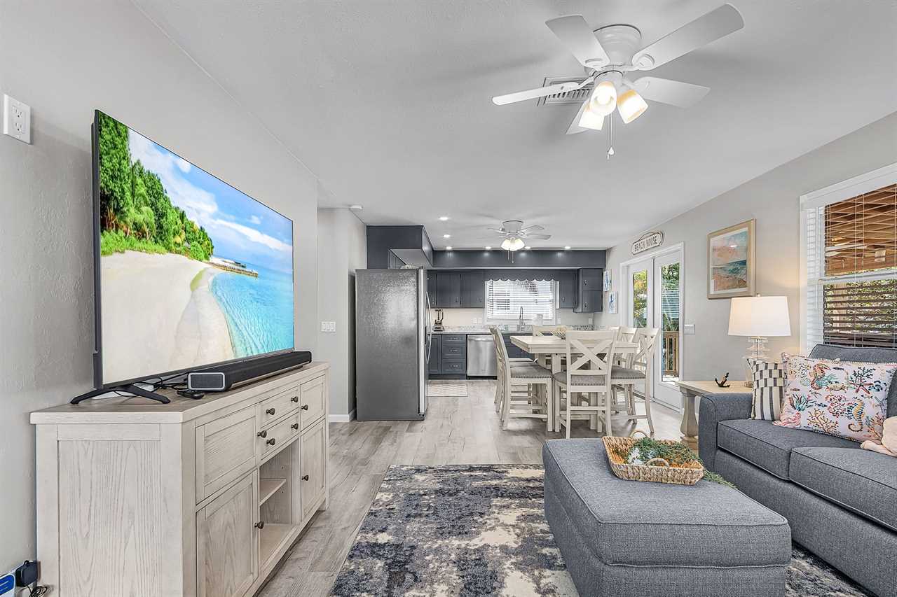 Step inside and you'll immediately feel at home in the spacious living room, decorated in fresh coastal tones. The living area features a large streaming TV and a queen-sized sleeper sofa, ideal for relaxing after a day in the sun or accommodating extra guests. There is NO washer & Dryer.