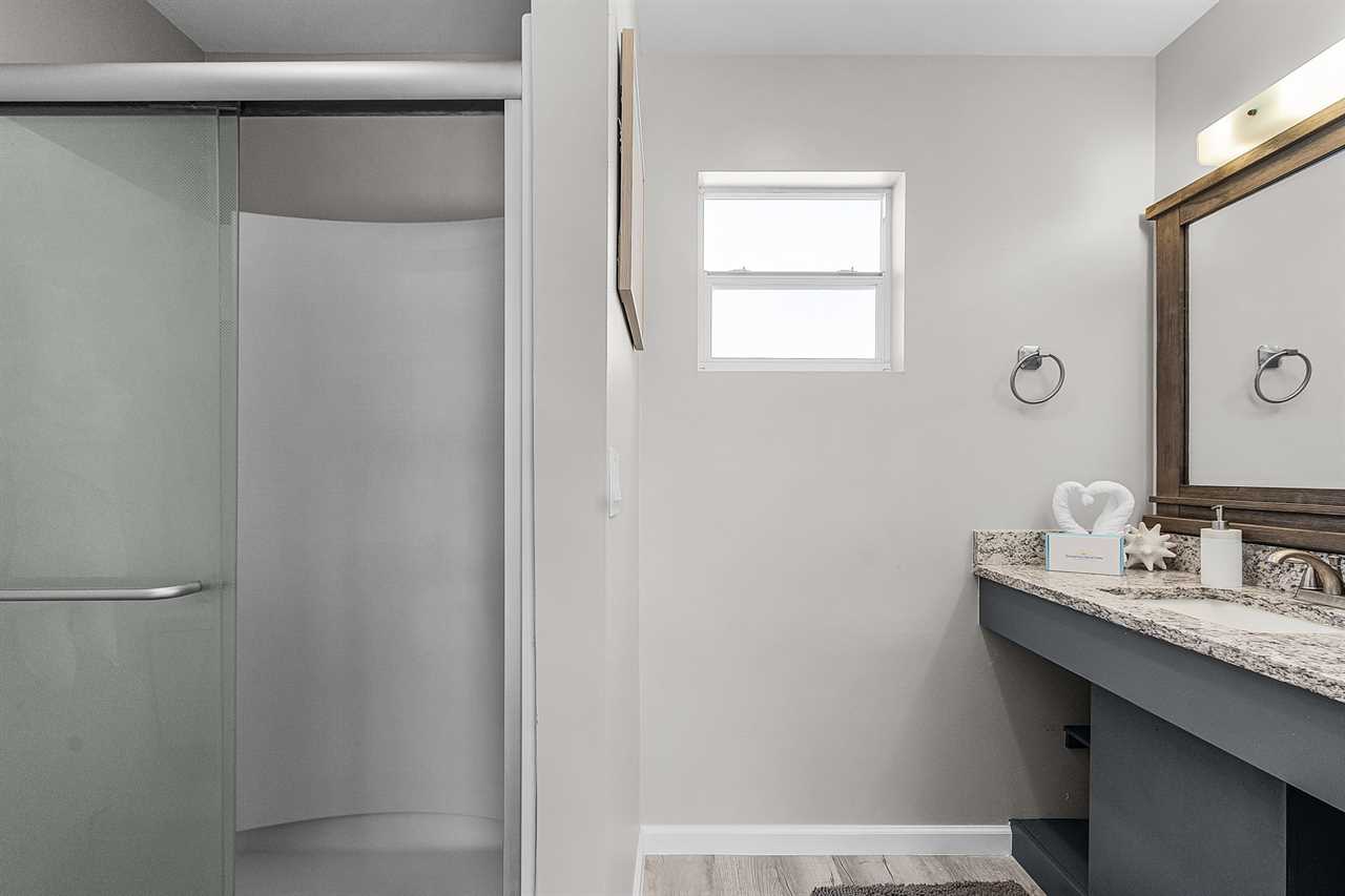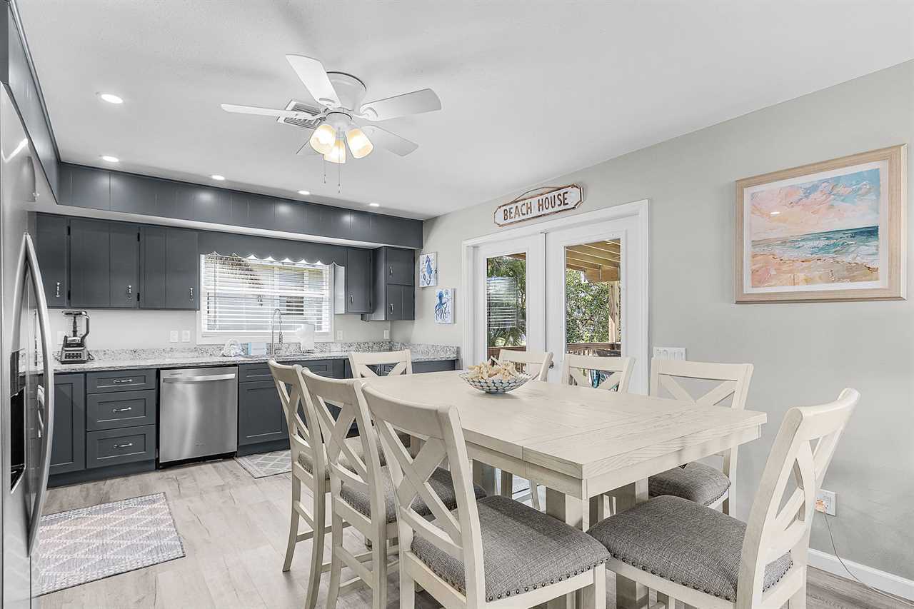 The newly renovated kitchen is a standout feature of this home. It's fully equipped with all-new appliances, modern cabinetry, and generous counter space for preparing family meals or beach snacks. The adjacent dining area seats eight comfortably, providing the perfect setting for shared meals and planning your next day's adventures.