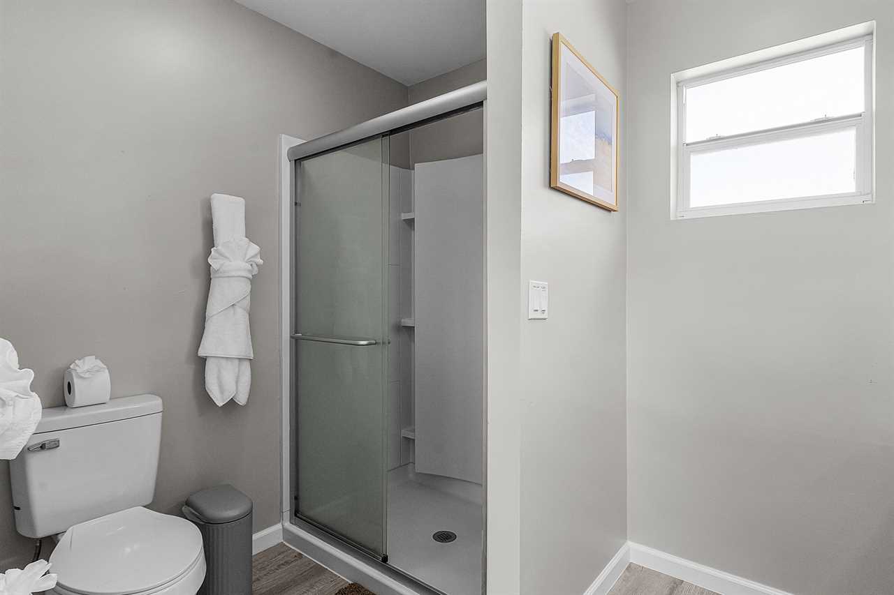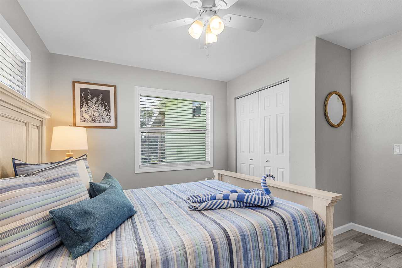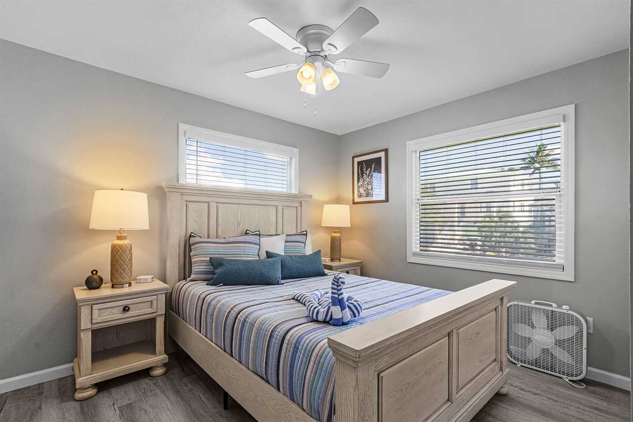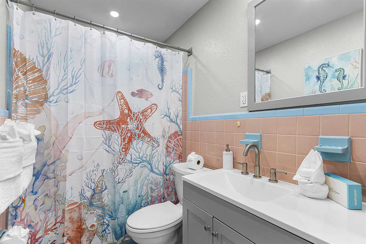 To the left of the kitchen, you'll find two comfortable bedrooms. The primary suite includes a king-sized bed, walk-in closet, and ensuite bathroom with a spacious walk-in shower and vanity. Just beyond the primary bedroom is an open bonus sleeping area furnished with a queen sleeper sofa — perfect for friends or family members who prefer to stay close by. The second bedroom features a plush queen bed and easy access to the nearby guest bathroom, which includes a tub/shower combo and single-sink vanity.