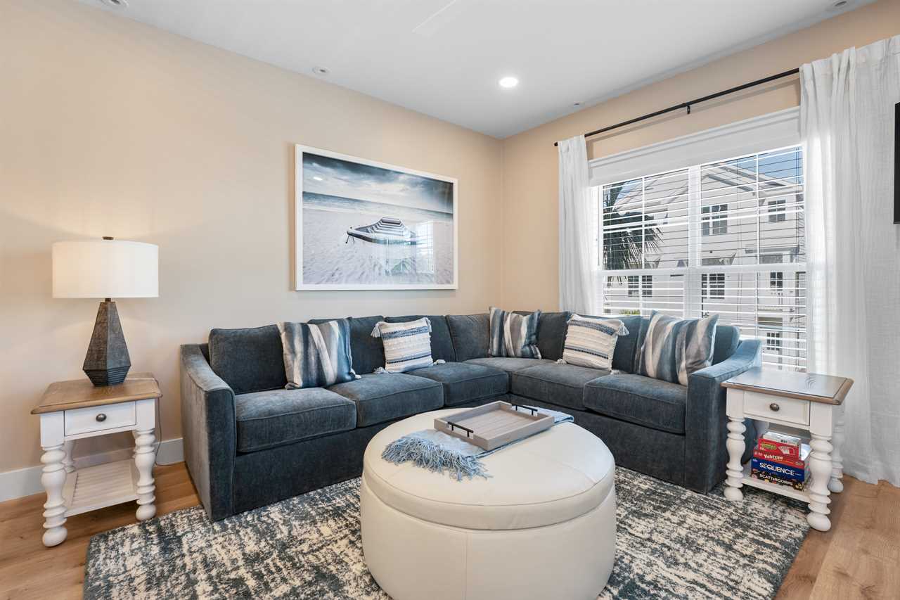 Relax in the inviting living area, thoughtfully designed for both comfort and entertainment. A plush gray sectional sofa, matching ottoman, large flat-screen Smart TV, and tasteful coastal décor create the ideal space to kick back after a day in the sun.