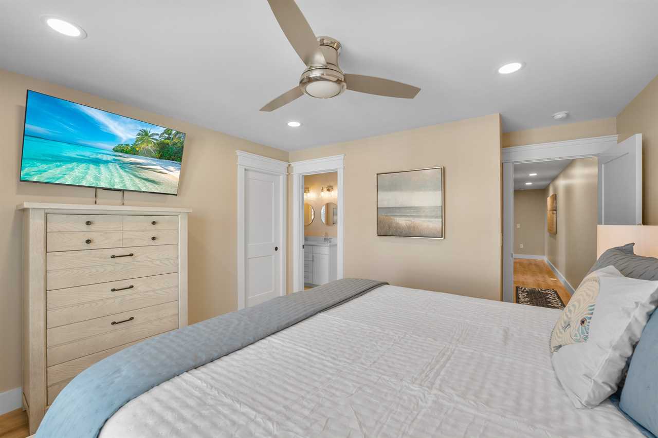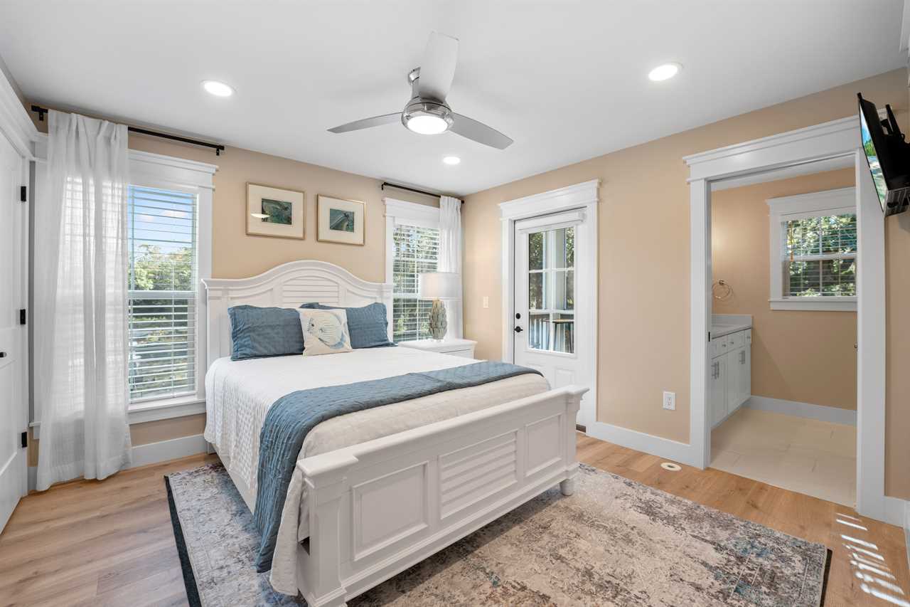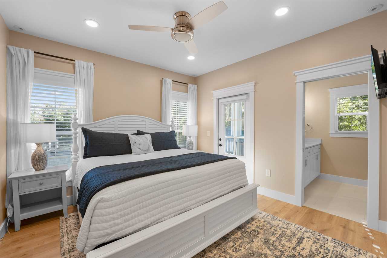 ✓ Bedroom 1: 1 King Bed, en-suite bathroom with double vanity, luxurious walk-in shower, access to private screened in porch deck, Smart TV