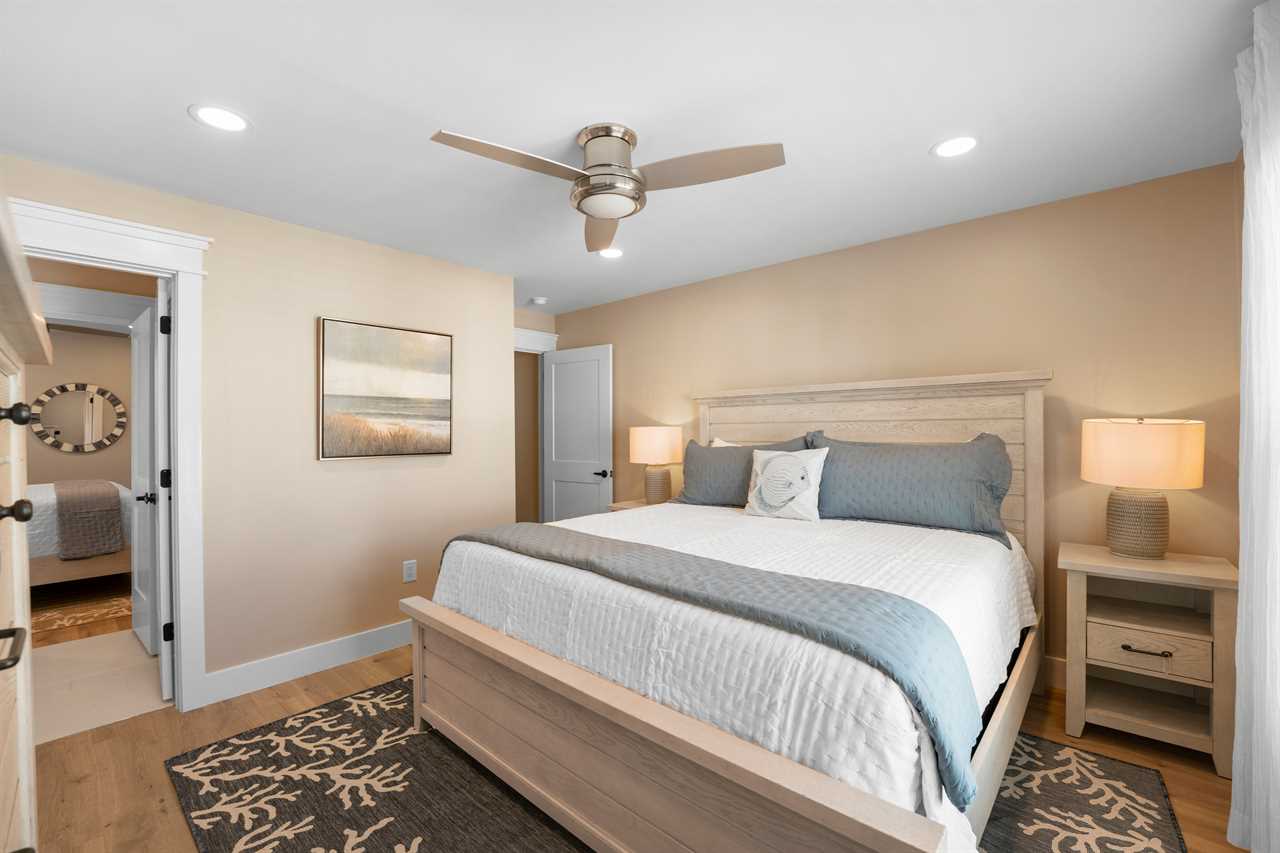 Head upstairs to the third floor, where the remaining bedrooms are located. Bedroom 2 offers a calming coastal retreat with a Queen bed, private en-suite with double vanity and walk-in shower, plus access to its own screened-in porch deck. Bedroom 3 has a Queen bed and Bedroom 4 features a King bed. Both share a Jack-and-Jill style bathroom with a double vanity and a tub/shower combination.