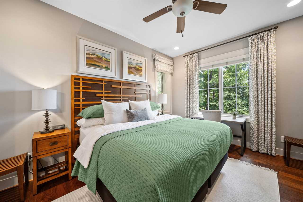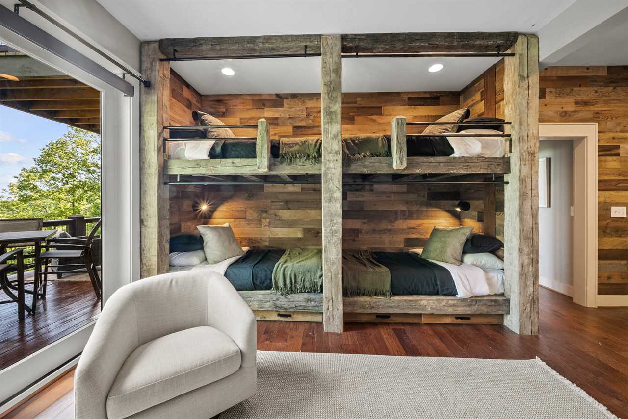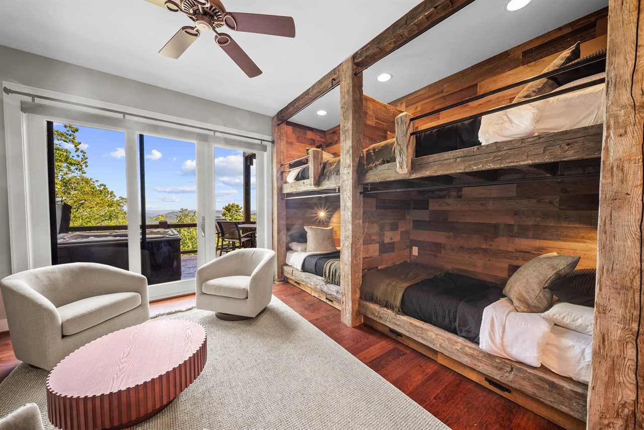 Downstairs, two additional bedrooms each feature a king bed and mountain views, with twin roll-out beds available for flexible sleeping arrangements. A custom bunk nook with two twin-over-twin built-ins makes an ideal spot for kids or teens. Altogether, Whispering Ridge Estate accommodates up to twelve guests.
