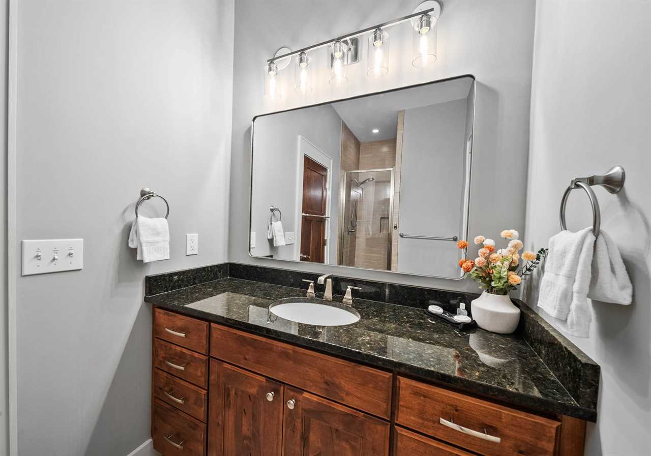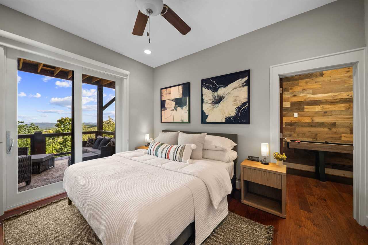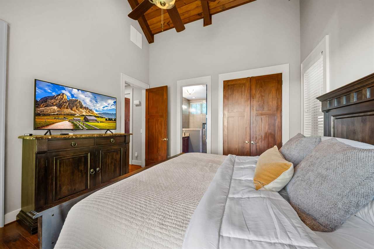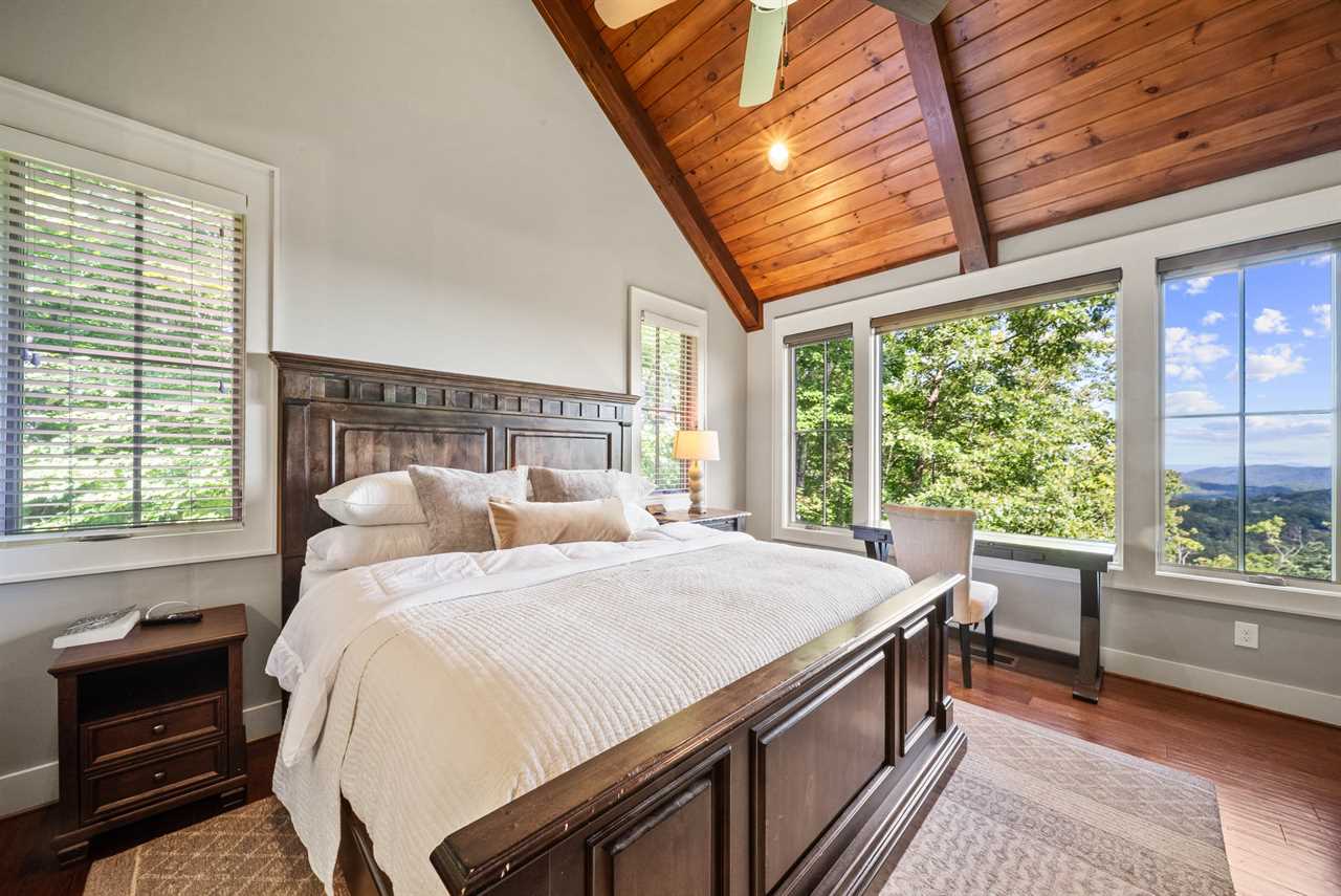 The main-level master suite offers a king bed, HD Smart TV, vaulted ceilings with exposed beams, and large windows that frame the mountains. Its spa-like ensuite bathroom boasts a double granite vanity and a tiled shower with a frameless glass door.