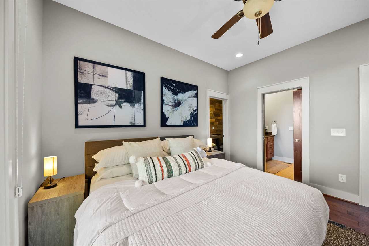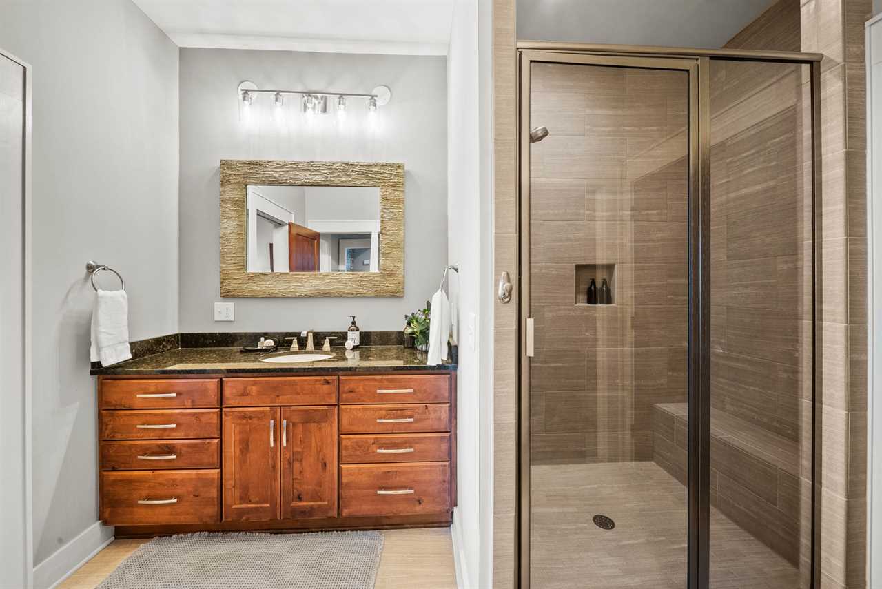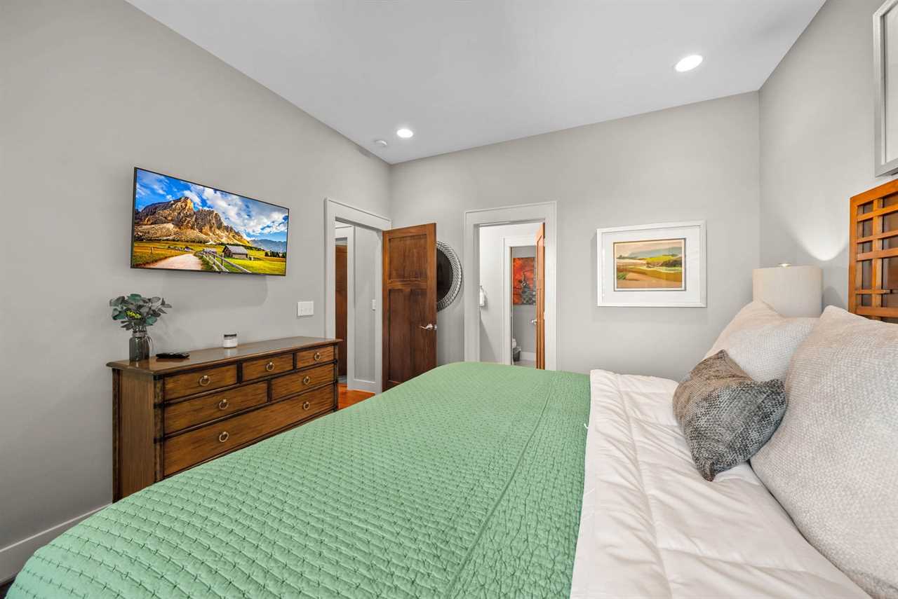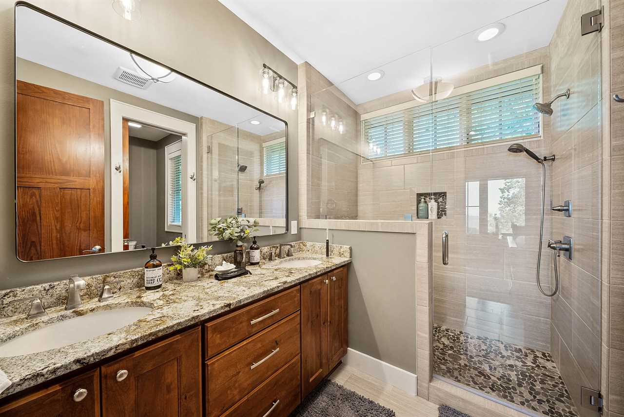 The main-level master suite offers a king bed, HD Smart TV, vaulted ceilings with exposed beams, and large windows that frame the mountains. Its spa-like ensuite bathroom boasts a double granite vanity and a tiled shower with a frameless glass door.