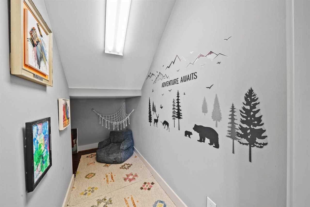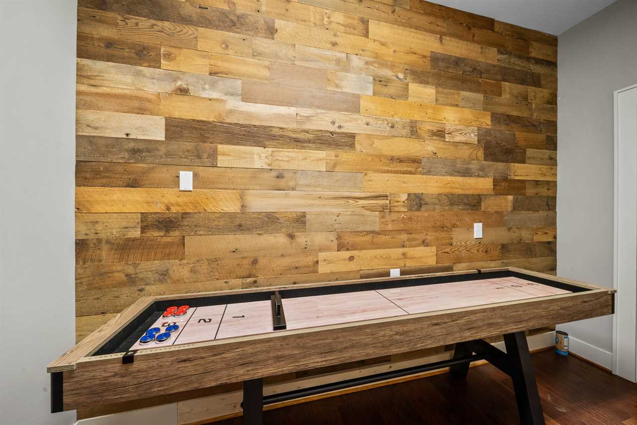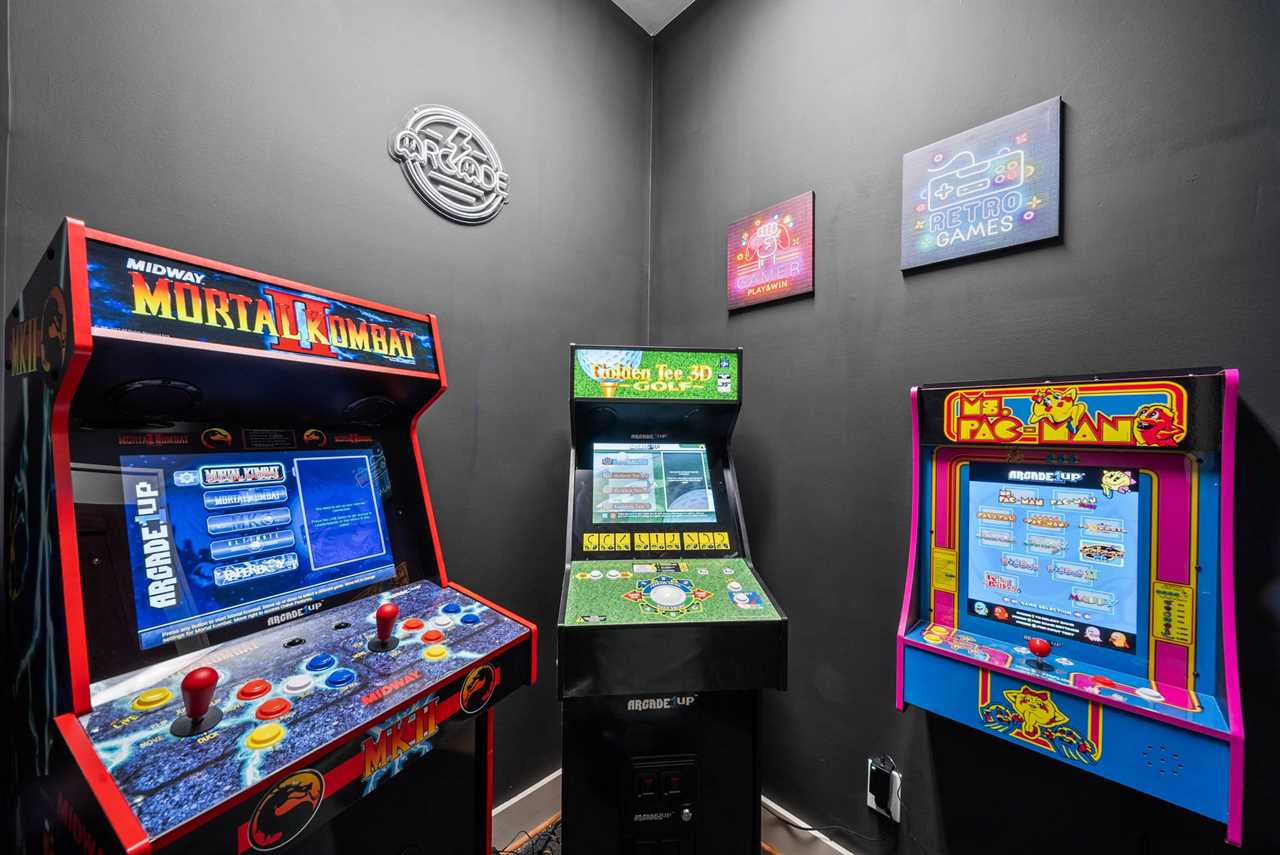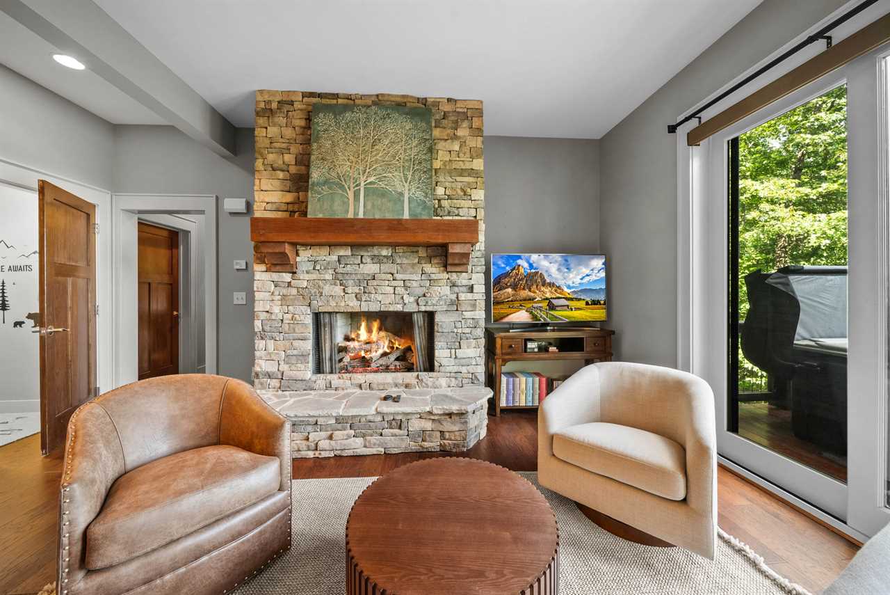 The lower level is designed for fun and relaxation. Guests will enjoy a shuffleboard table, poker table, and multiple arcade games. A stacked-stone fireplace, large HD Smart TV, and plush seating create a cozy atmosphere, while glass doors open to the lower-level deck where a brand-new hot tub awaits with incredible mountain views.