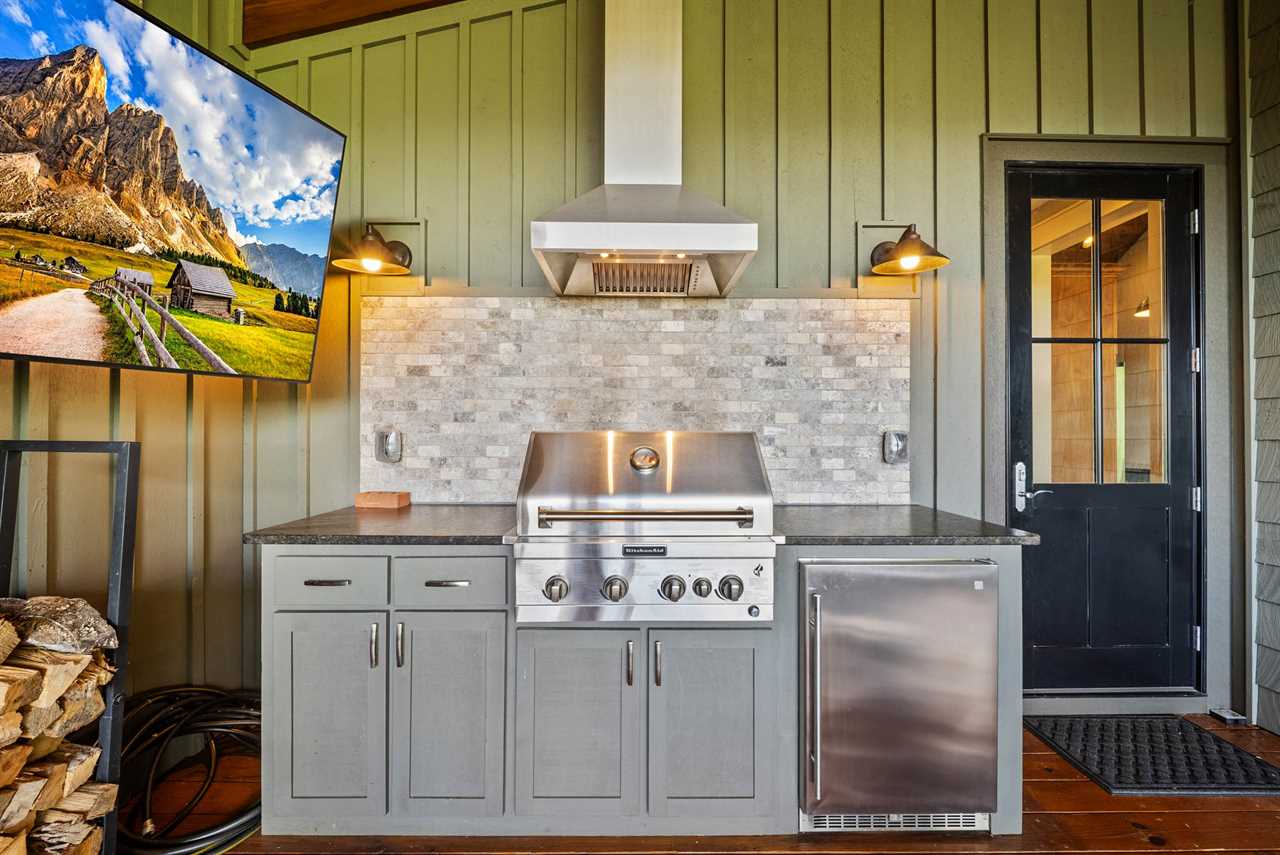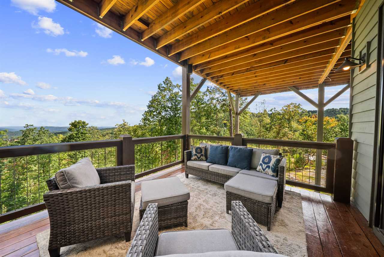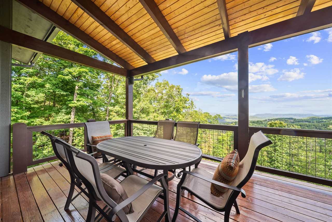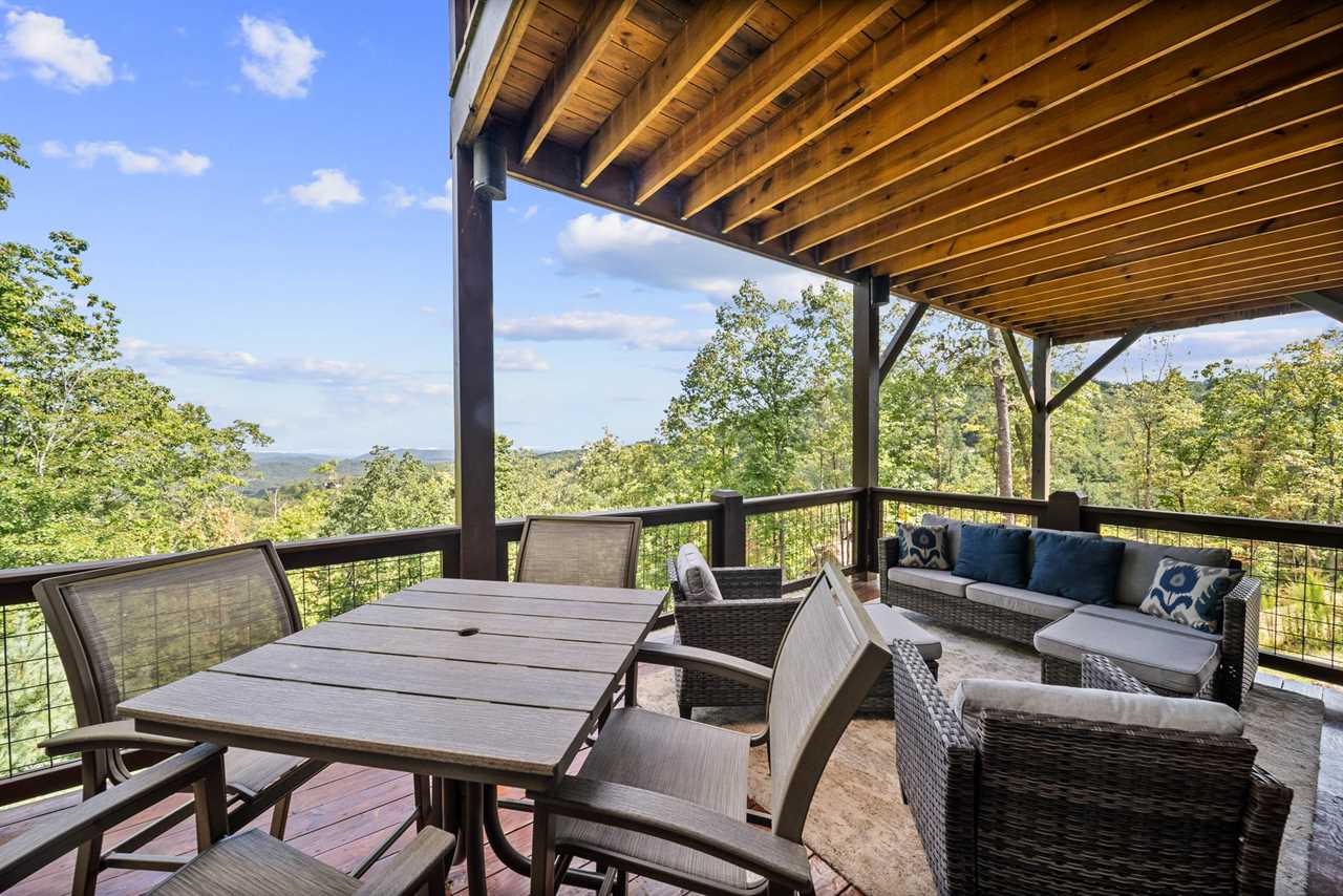 The great room is anchored by a stacked-stone gas fireplace, cozy seating, and an HD Smart TV—perfect for gathering after a day of mountain adventures. Just outside, a covered deck extends the living space with dining for eight, a stainless gas grill, comfortable lounge seating, a wood-burning fireplace, and a deck-mounted TV. Whether enjoying morning coffee, al fresco dinners, or stargazing by the fire, the views will take your breath away.