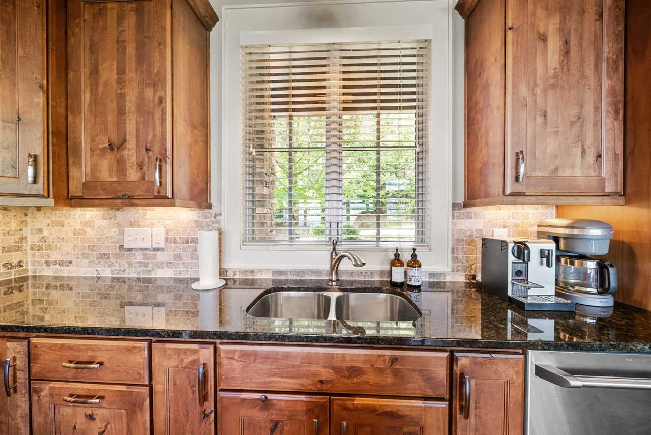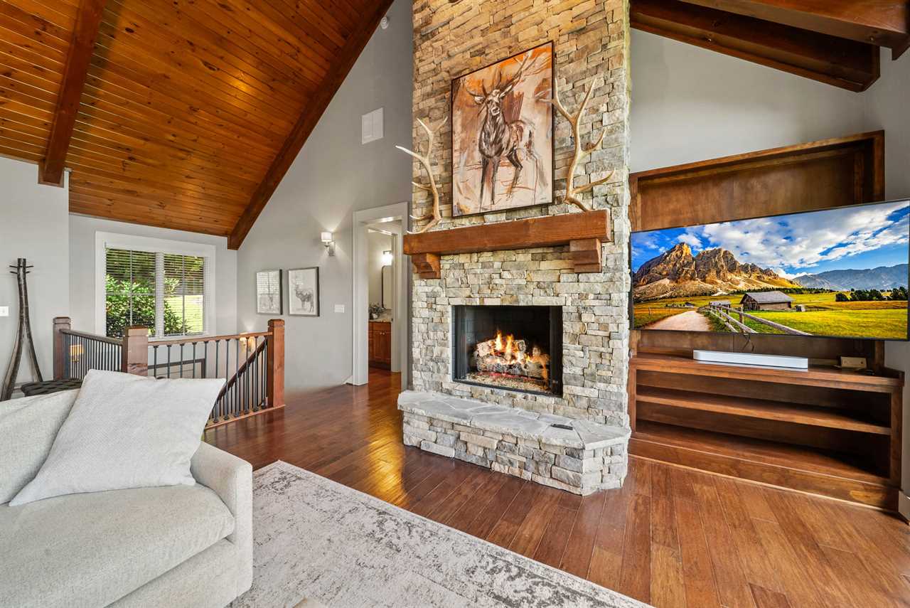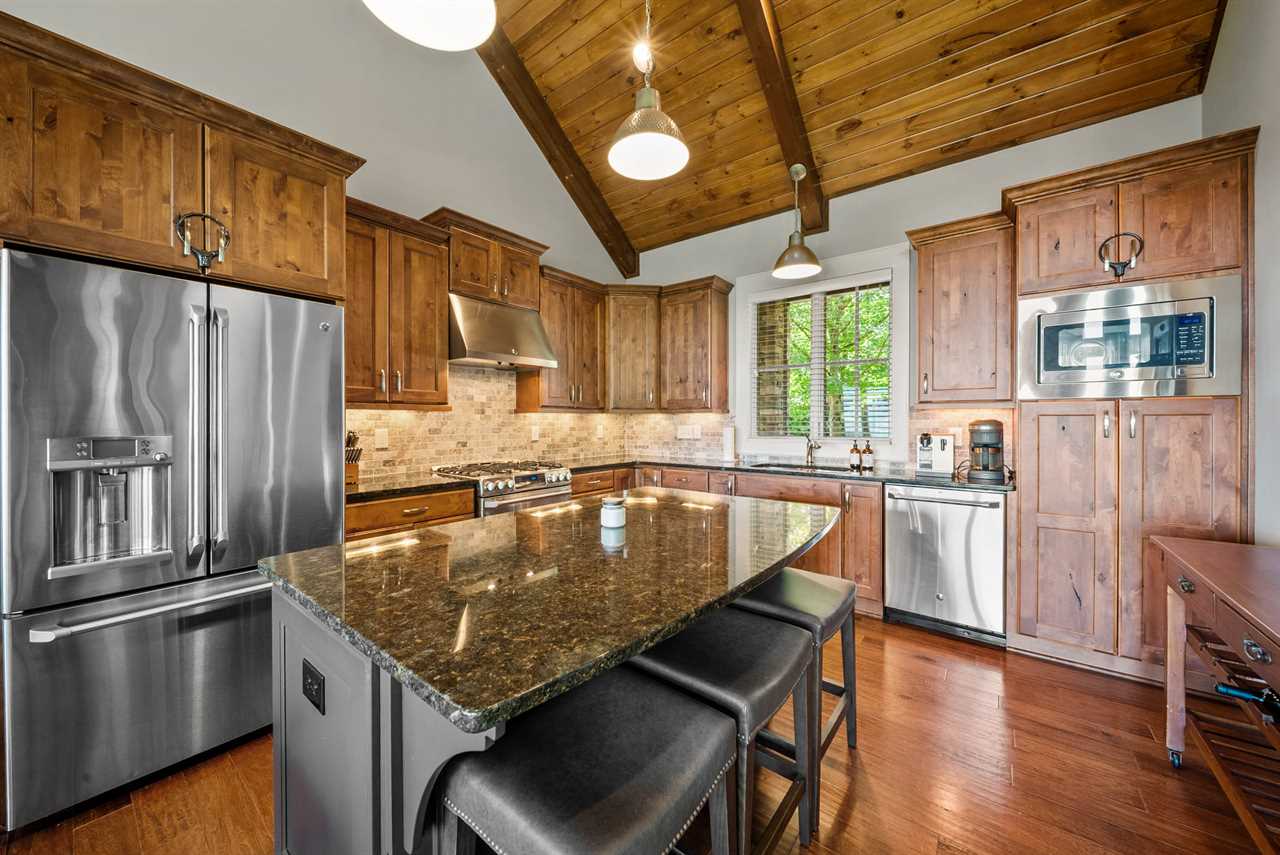 Step inside to an inviting open-concept layout, where vaulted tongue-and-groove ceilings with exposed beams soar above rich hardwood floors. Oversized windows and glass doors frame the endless mountain vistas while filling the space with natural light. The gourmet kitchen features stainless appliances, a gas cooktop, granite counters, and custom Shaker-style cabinetry. A large island seats four, while the farmhouse-style dining table comfortably accommodates eight more.